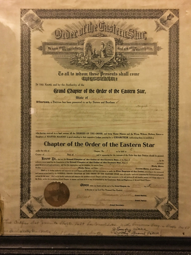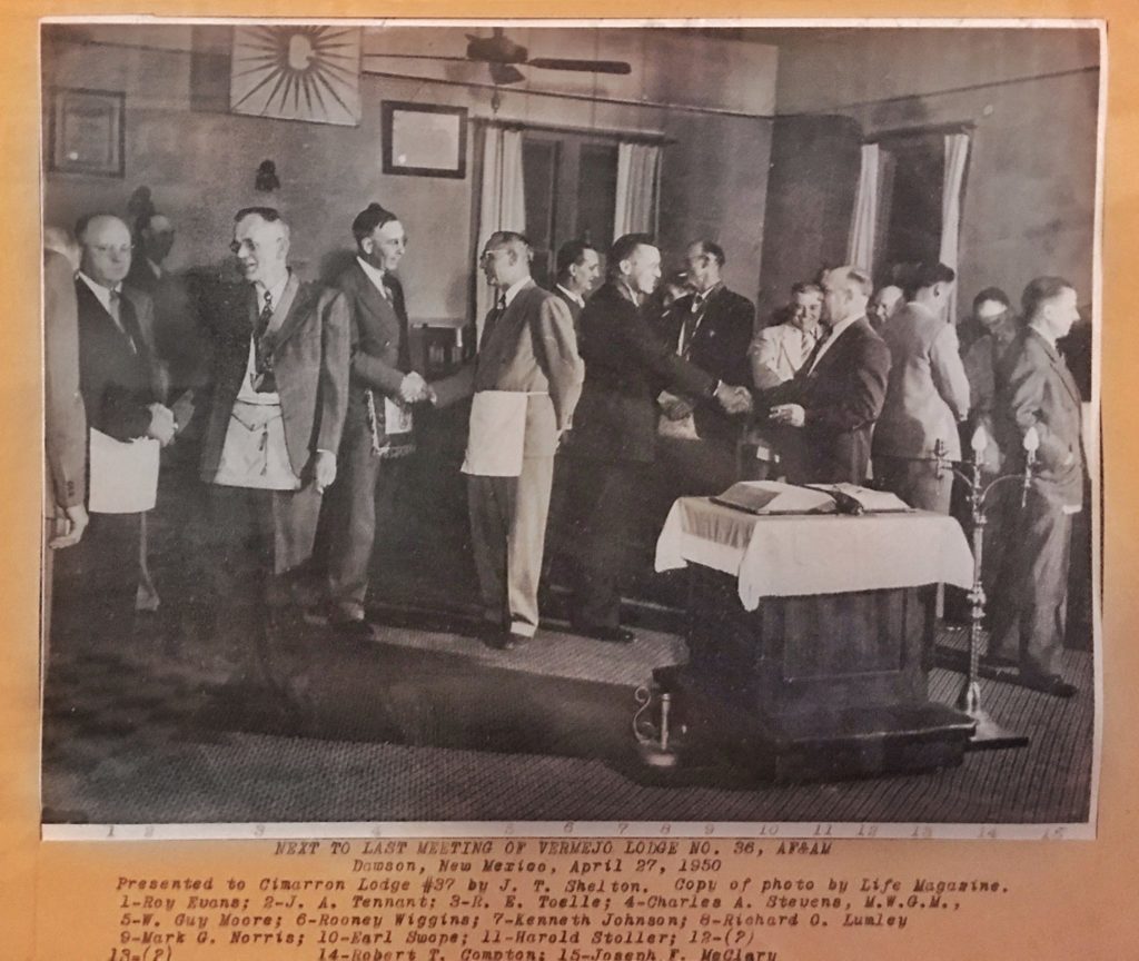 In 1907 a group of men from the mining town of Dawson, N.M. petitioned the Grand Lodge of New Mexico to become a chartered lodge. In December of 1907 they were granted a charter and they became “Vermejo Lodge #36”. Early in 1908 Cimarron also petitioned to receive a charter from the Grand Lodge of New Mexico and they were granted a charter in 1908, and they became “Cimarron Lodge #37”.